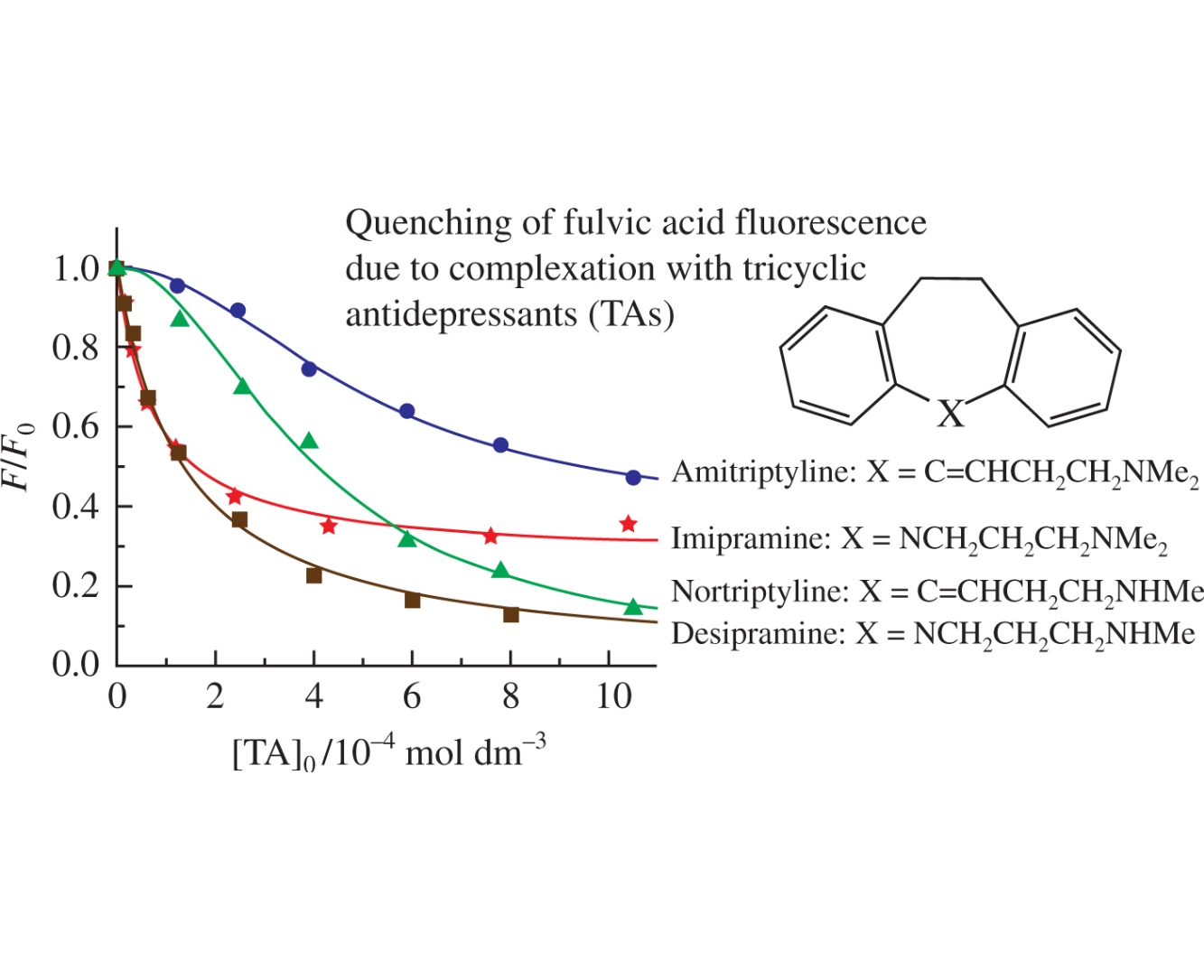 Intermolecular interactions between humic substances (HSs) and the tricyclic antidepressants (TAs) amitriptyline, nortriptyline, imipramine and desipramine were detected for the first time by fluorescence spectroscopy. Two simplest models assuming coordination of one or two of TA molecules at the binding centers of HSs were proposed to explain the photodegradation of TAs caused by sunlight photolysis of humic substances.