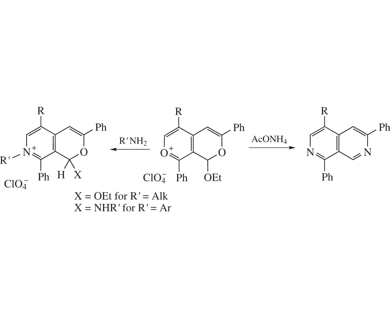The reaction of 1H-pyrano[3,4-c]pyran-7-ium perchlorates with ammonium acetate gives 2,7-naphthyridines, while in their reaction with primary amines pyrano[3,4-c]pyridinium salts are formed. The structure of 7-[2-(dimethylamino)ethyl]-1-ethoxy-5-methyl-3,8-diphenyl-1H-pyrano[3,4-c]pyridin-7-ium perchlorate was established by X-ray diffraction.