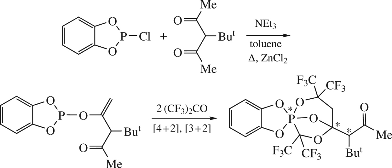 Catalytic (ZnCl2, Et3N) phosphorylation of tert-butylacetylacetone with 2-chloro-1,3,2-benzodioxaphosphole unexpectedly occurs with elimination of proton from the methyl group and leads to vinyloxyphosphole derivative, viz., 4-(1,3,2-benzodioxaphosphol-2-yloxy)-3-tert-butylpent-4-en-2-one. Its reaction with hexafluoroacetone gives a cage phosphorane as a result of subsequent chemoselective [4+2]- and [3+2]-cycloadditions with stereoselectivity above 95%.