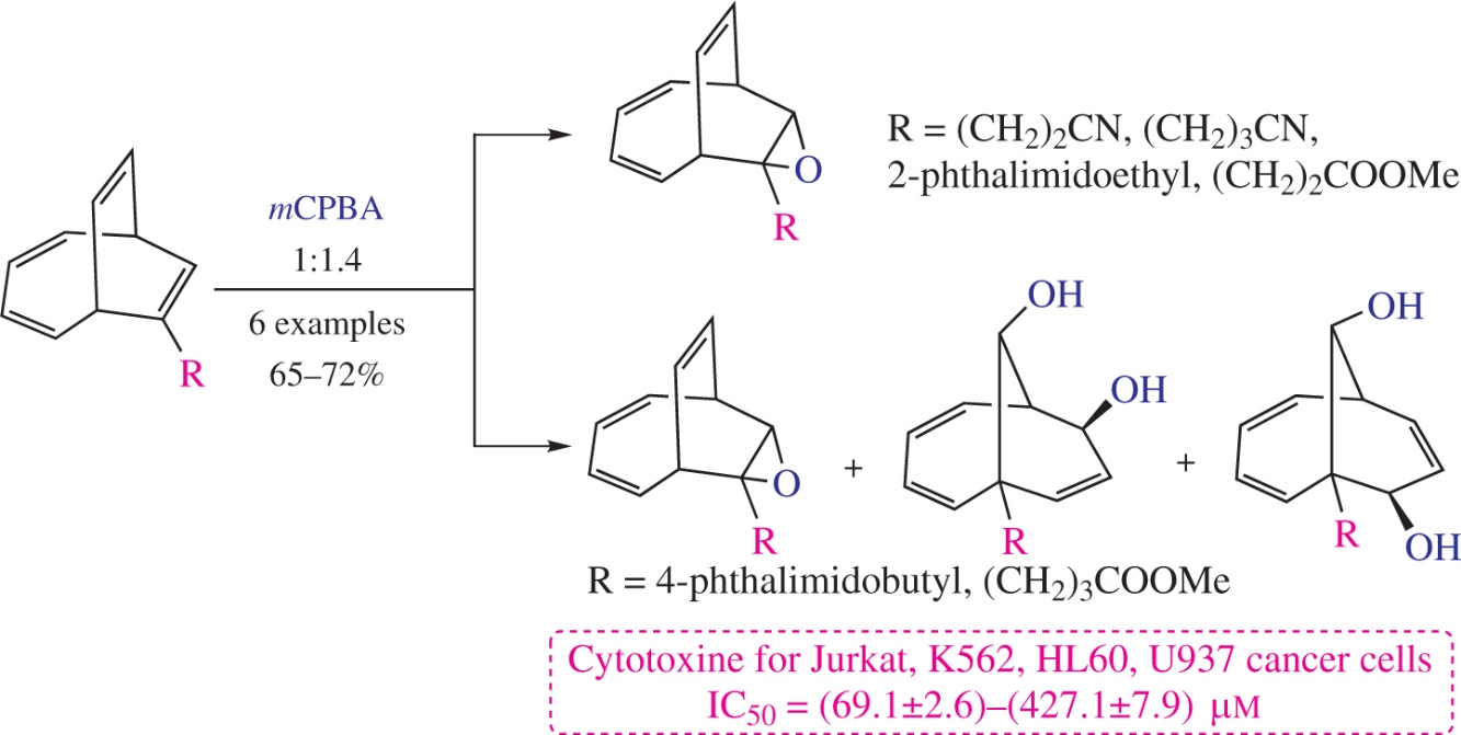 The oxidation of functionally substituted bicyclo[4.2.2]deca-2,4,7,9-tetraenes with m-chloroperbenzoic acid affords practically valuable 8-oxatricyclo[4.3.2.07,9]undeca-2,4,10-trienes and bicyclo[4.3.1]deca-2,4,8-triene-7,10-diols in yields of 65–72%. The structures of the products were established by advanced spectral methods and X-ray diffraction analysis. The new compounds were screened for in vitro cytotoxicity against Jurkat, K562, U937 and HL60 tumor cell lines.