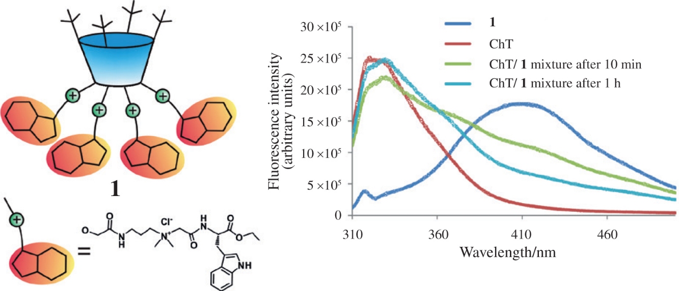 A p-tert-butylthiacalix[4]arene derivative containing tryptophan moieties on the lower rim was synthesized and proposed as a chymotrypsin inhibitor. Its ability to competitively inhibit the enzyme was revealed by kinetic methods. A mechanism of the inhibitory action has been established, which consists in the binding of macrocycle tryptophan moieties to the enzyme active site, resulting in its blocking.