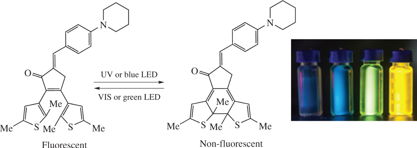 A mechanistic examination of the photochemical properties of a dithienylethene-containing push-pull system with the cyclopentenone bridge has been performed using time-resolved methods. The molecule studied possesses a notable combination of photochromic and fluorescent properties. Visible light only switching was accomplished using blue and green LED sources.