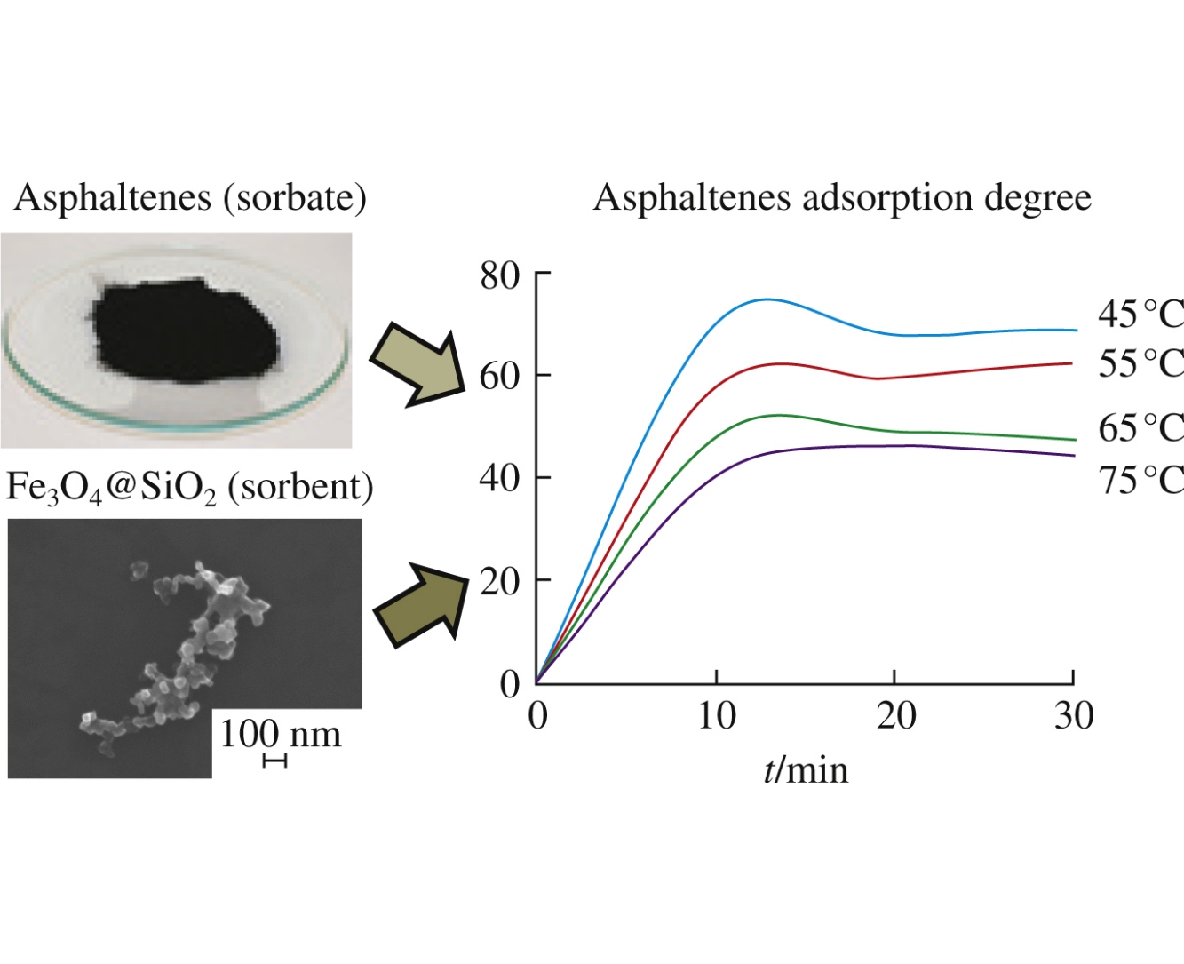 Highly dispersed materials Fe3O4@TEOS and Fe3O4@PVP for asphaltenes extraction from organic media have been synthesized via modifications of nanosized magnetite with tetraethoxysilane and N-polyvinylpyrrolidone. Using model compounds simulating the main functional groups of asphaltenes and some natural asphaltenes isolated from crude oil, the sorption capacity was estimated for Fe3O4@TEOS. It was found that the extraction degree of asphaltenes from a toluene solution at 45°C reached 65–70%, and the sorption capacity was 28mgg–1.