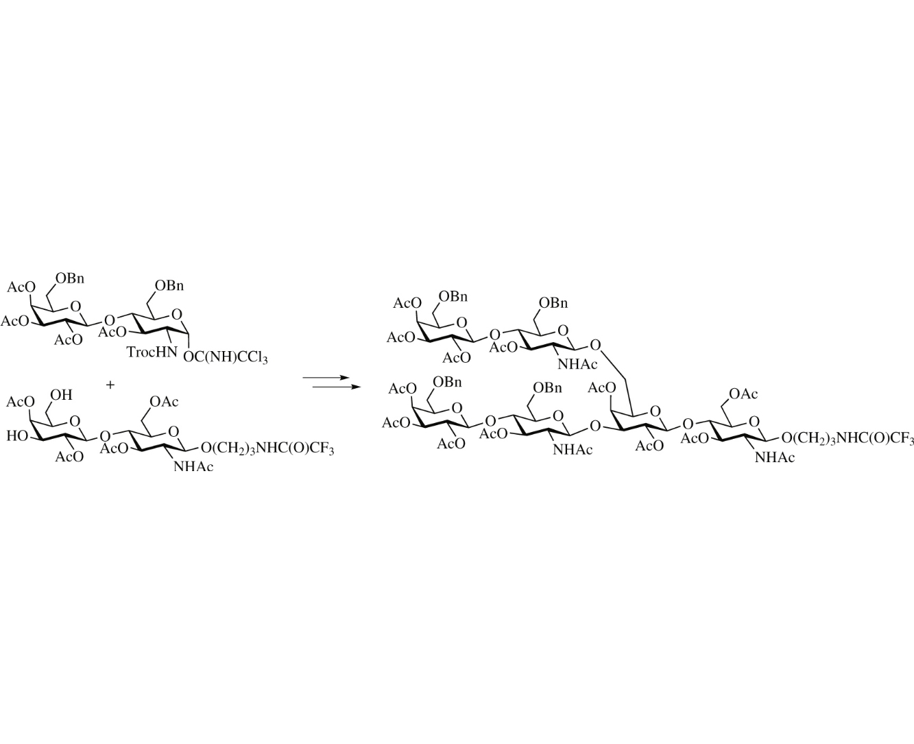 The protected spacer-armed branched tri-N-acetyllactosamine has been synthesized as a building block for the synthesis of biantennary ABH blood group antigens. The key synthetic step is the simultaneous glycosylation of the 3′- and 6′-OH groups of an N-acetyllactosamine glycosyl acceptor by N-Troc-lactosamine trichloroacetimidate.