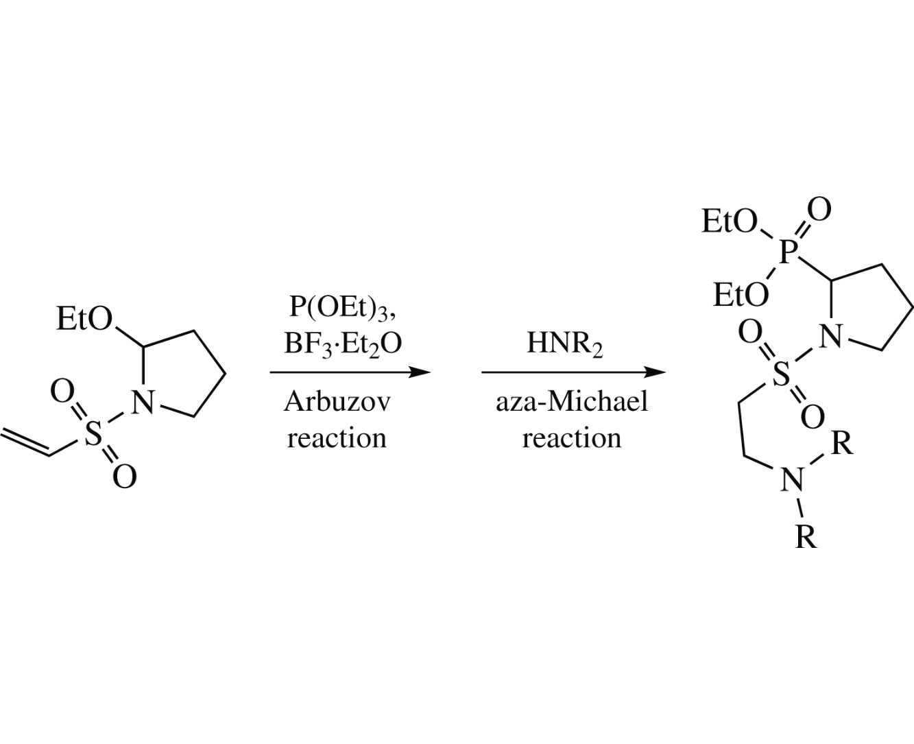 1-(2-Aminoethylsulfonyl)-2-phosphorylpyrrolidines have been synthesized via boron trifluoride-catalyzed Arbuzov reaction of 2-ethoxy-1-(vinylsulfonyl)pyrrolidine with triethyl phosphite followed by aza-Michael reaction of thus obtained 2-phosphoryl-1-(vinylsulfonyl)pyrrolidine with secondary amines. The cytotoxicity of the prepared 1-(2-aminoethylsulfonyl)-2-phosphorylpyrrolidines against M-Hela tumor cell line is comparable with that of tamoxifen, whereas the cytotoxicity against normal cell line is twofold lower.