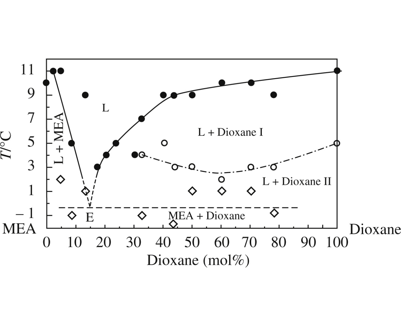 The monoethanolamine–dioxane system was examined by the DSC performed at various cooling/heating rates in the temperature range from −140 to +25°C. Rapid cooling revealed that the system undergoes a glass transition at about −120°C, while in the case of slow cooling, the crystallization of two dioxane phases was observed at +4 and −20°C. The phase diagram of eutectic type with strong supercooling of the liquid phase was obtained for this system.