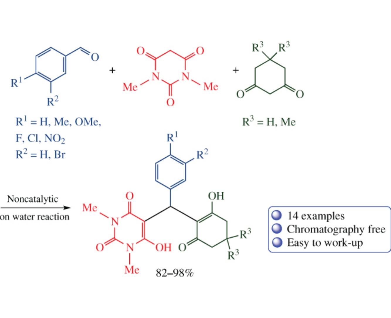 Heating aldehydes, N,N’-dimethylbarbituric acid and cyclohexane-1,3-diones in water results in fast formation of Knoevenagel–Michael adducts in 82–98% yields. This multicomponent process opens facile, efficient and environmentally benign way to the new functionalized [(2-hydroxy-6-oxocyclohex-1-en-1-yl)(aryl)methyl]pyrimidine-2,4(1H,3H)-diones bearing both barbituric acid and cyclohexane-1,3-dionemoieties separated by arylmethylene spacer, which are promising compounds for biomedical applications including analeptics, anti-AIDS and anticancer remedies.