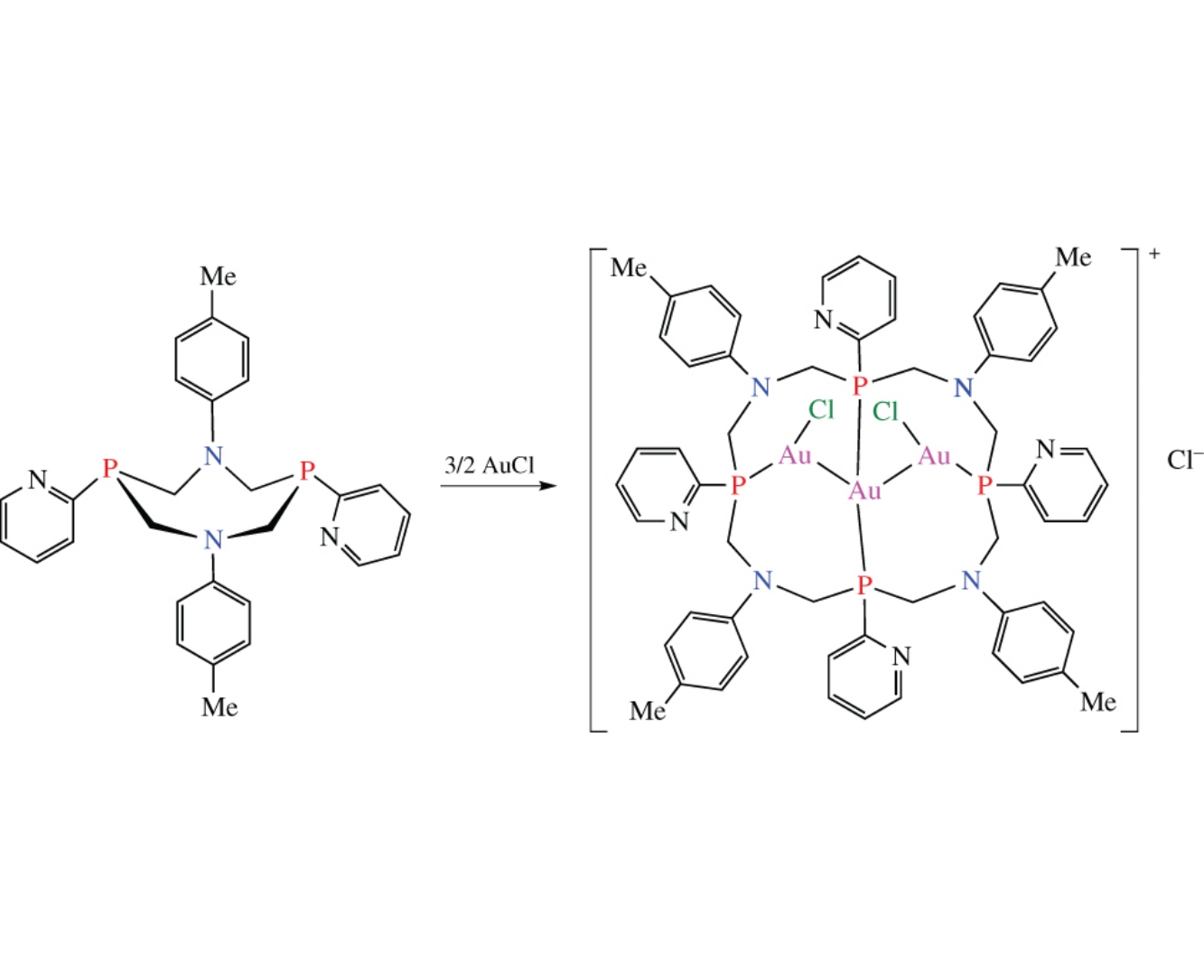 The reaction of gold(i) chloride with two molecules of 1,5-diaza-3,7-diphosphacyclooctane derivative causes their reorganization into 16-membered macrocyclic tetraphosphine ligand. The structure of the trinuclear gold(i) complex obtained was confirmed by X-ray analysis. The dynamic equilibrium between dinuclear gold(i) complexes with eight-membered cyclic ligands and the trinuclear gold(i) complex with 16-membered ones has been revealed.