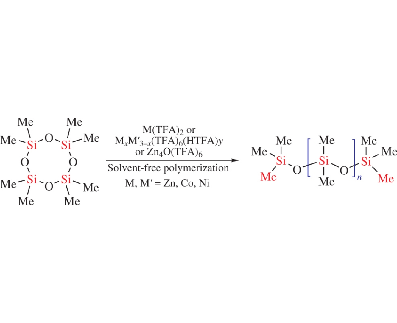 3d-Metal trifluoroacetate complex-catalyzed ring opening polymerization of octamethylcyclotetrasiloxane affords polydimethylsiloxanes whose molecular weight can be controlled by the nature of 3d metal complexes, in particular, by their structural type, and by the polymerization conditions. The best results were achieved using tetranuclear zinc oxotrifluoroacetate as the catalyst at a temperature of 75°C and a reaction time of 35h.
