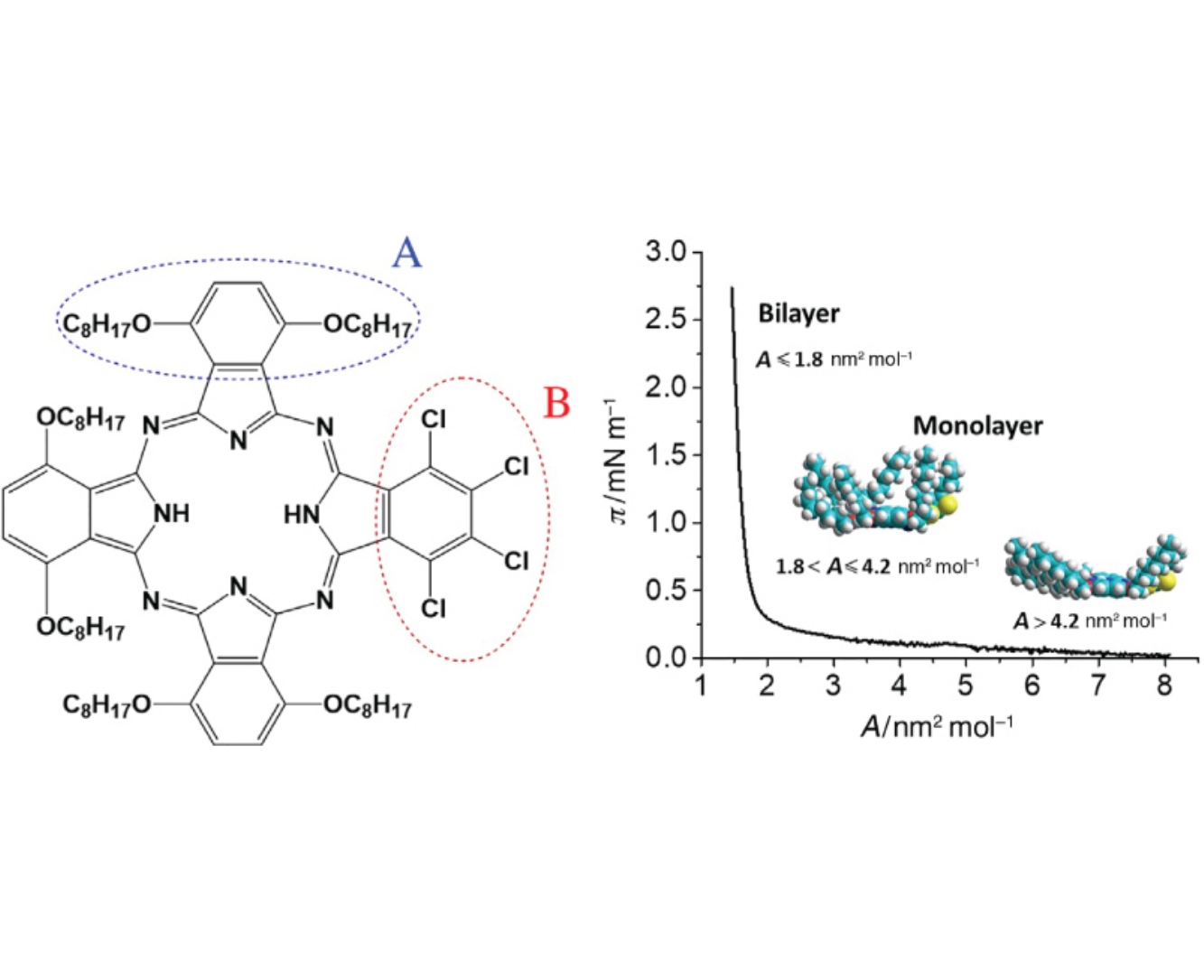 To design efficient thin-film materials for low cost organic nanoelectronic devices, the Langmuir floating layer structure of the mesogenic 1,4,8,11,15,18-hexaoctyloxy-22,23,24,25-tetrachlorophthalocyanine (A3B-type) was characterized by Brewster angle microscopy, grazing incidence diffraction, and reflectometry. Starting from the area per one molecule of 7.6nm2, a single two-dimensional ordered structure with the period of 2.3nm was formed. When the area reaches the value of 2.5 nm2, a stable bilayer structure with imperceptible number of 3D aggregates was detected, in which each monolayer preserved organization of the preceding monolayer.