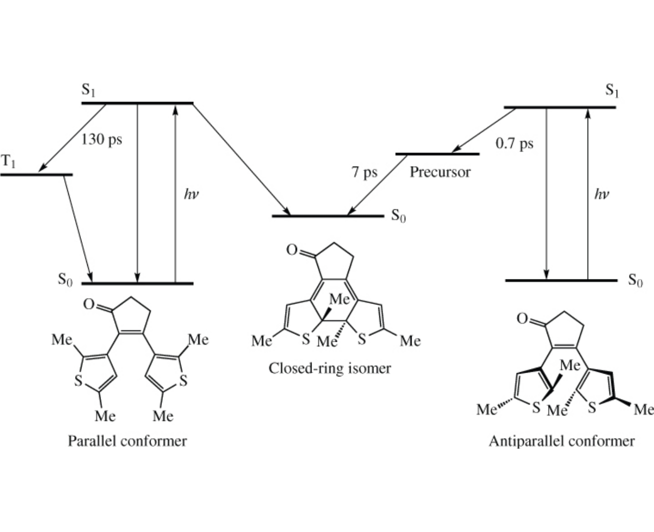 Early processes in photochemistry of 2,3-bis(2,5-dimethylthiophen-3-yl)cyclopent-2-enone were explored using the ultrafast pump-probe spectroscopy. The photocyclization occurs from the antiparallel conformation of an open form on a time scale of 7 ps, while the parallel conformation exhibits an intersystem crossing within 130 ps. The mechanism and timescales were revealed as typical of other thiophene-containing diarylethenes.