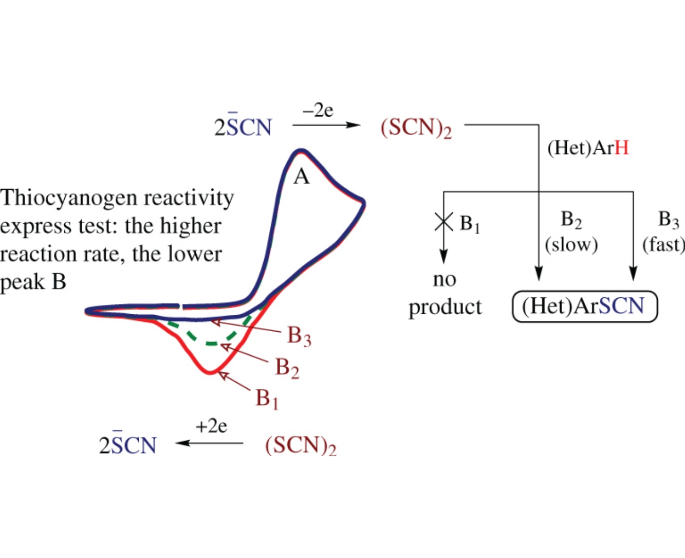 The height of thiocyanogen reduction peak on cyclic voltammograms of thiocyanate ion can serve as the criterion for thiocyanogen reactivity towards hetarenes present in the electrolyte. This allows one to predict the efficiency of anodic thiocyanation of various hetarenes.