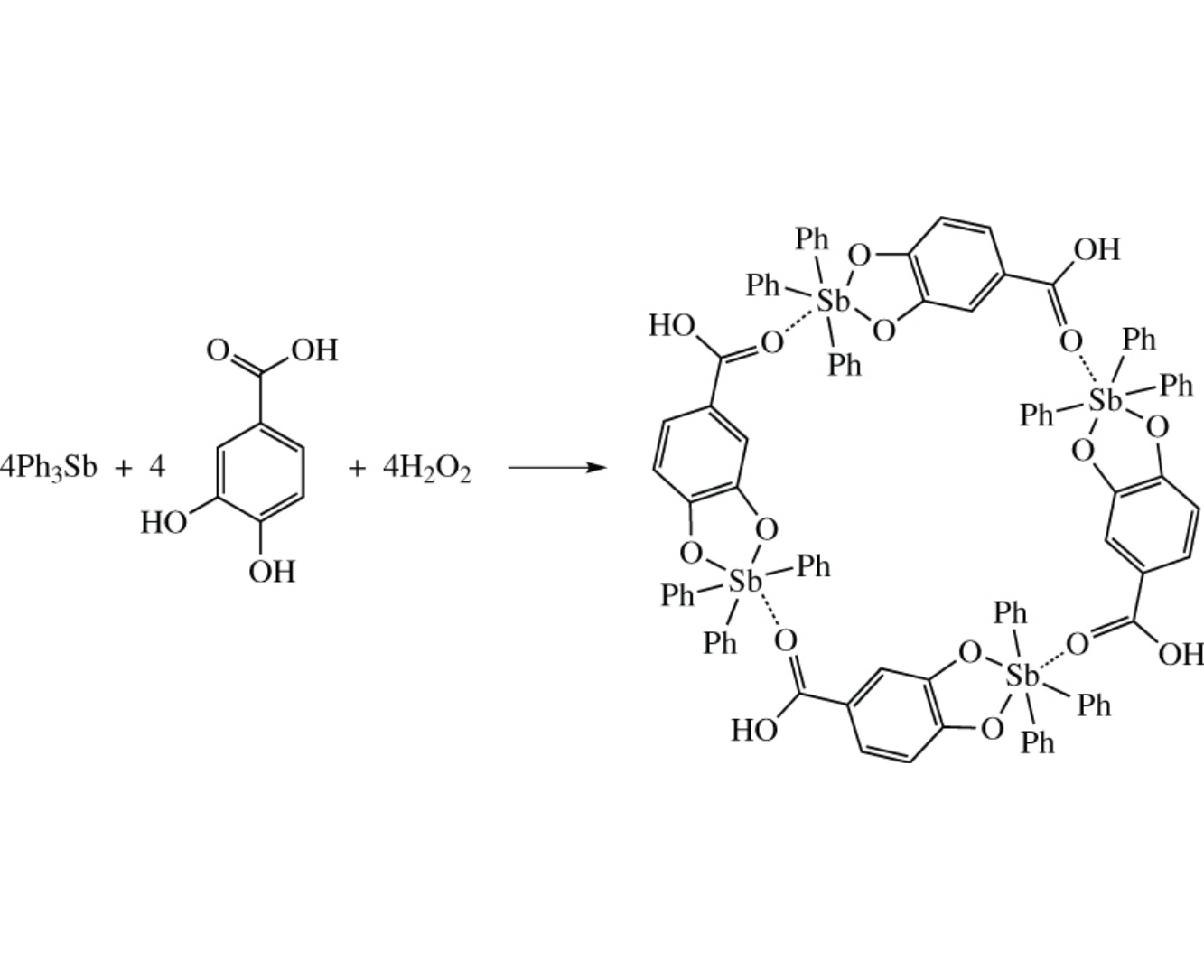 The reaction of triphenylantimony with 3,4-dihydroxybenzoic acid in diethyl ether in the presence of hydrogen peroxide afforded a tetranuclear macrocyclic complex, which was characterized by X-ray diffraction data.