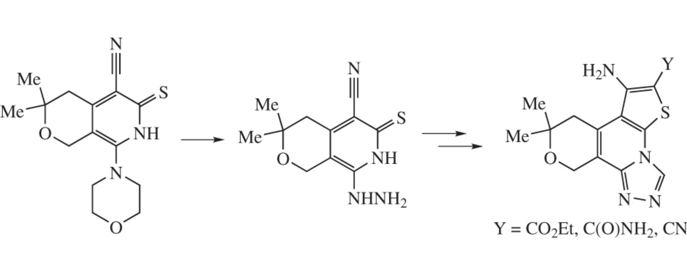 New effective synthesis of functionalized pyrano[3,4-c]thieno-[3,2-e][1,2,4]triazolo[4,3-a]pyridines comprises nucleophilic substitution in 8-morpholino-6-thioxopyrano[3,4-c]pyridine-5-carbonitrile with hydrazine hydrate followed by sequential heterocyclization with formic acid and chloroacetic acid derivatives.