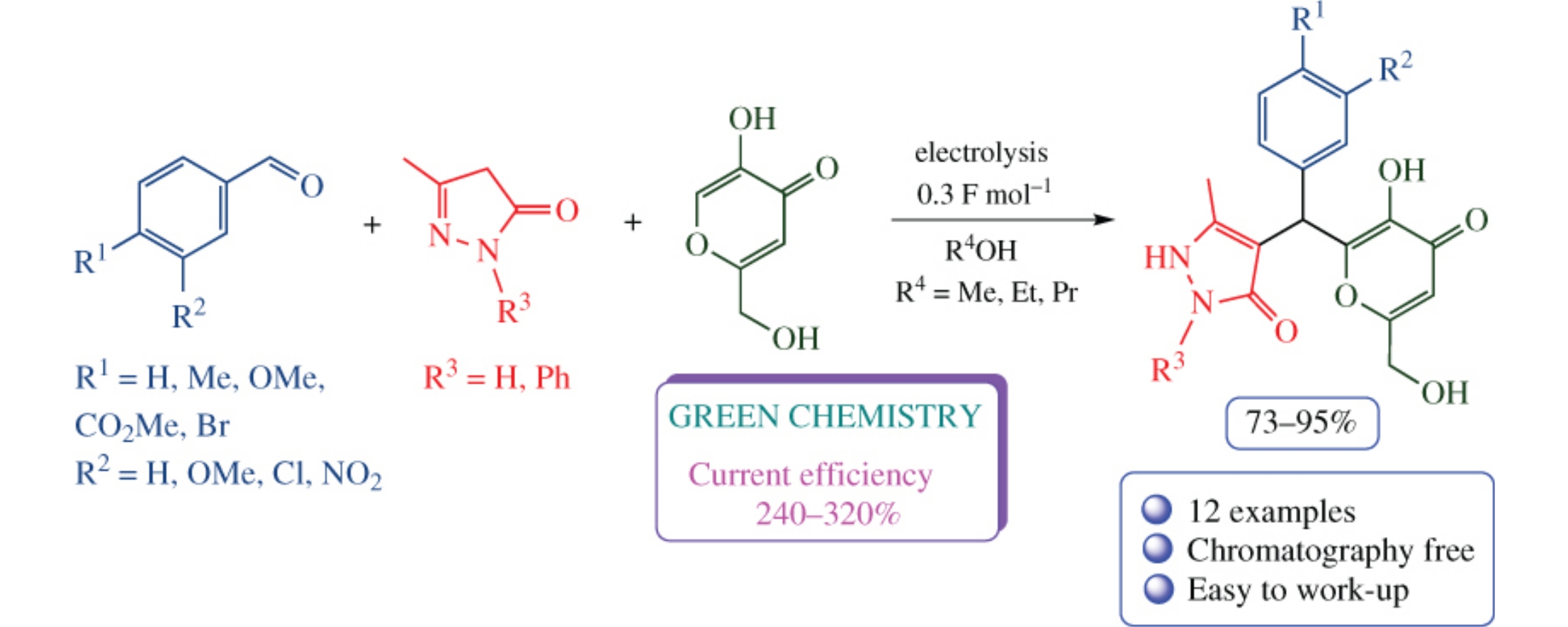 Electrocatalytic transformation of aldehydes, 2,4-dihydro-3H-pyrazol-3-ones and kojic acid in alcohols occurs in an undivided cell in the presence of sodium halides, selectively affording substituted 4-{[3-hydroxy-6-(hydroxymethyl)-4-oxo-4H-pyran-2-yl](aryl)methyl}-5-methyl-1,2-dihydro-3Hpyrazol-3-ones in 73–95% yields and with 240–320% current efficiency. The multicomponent process provides a facile and efficient way to the new type of systems with heterocyclic moieties separated by aryl-substituted C-spacer. The product structure has been confirmed by X-ray diffraction data