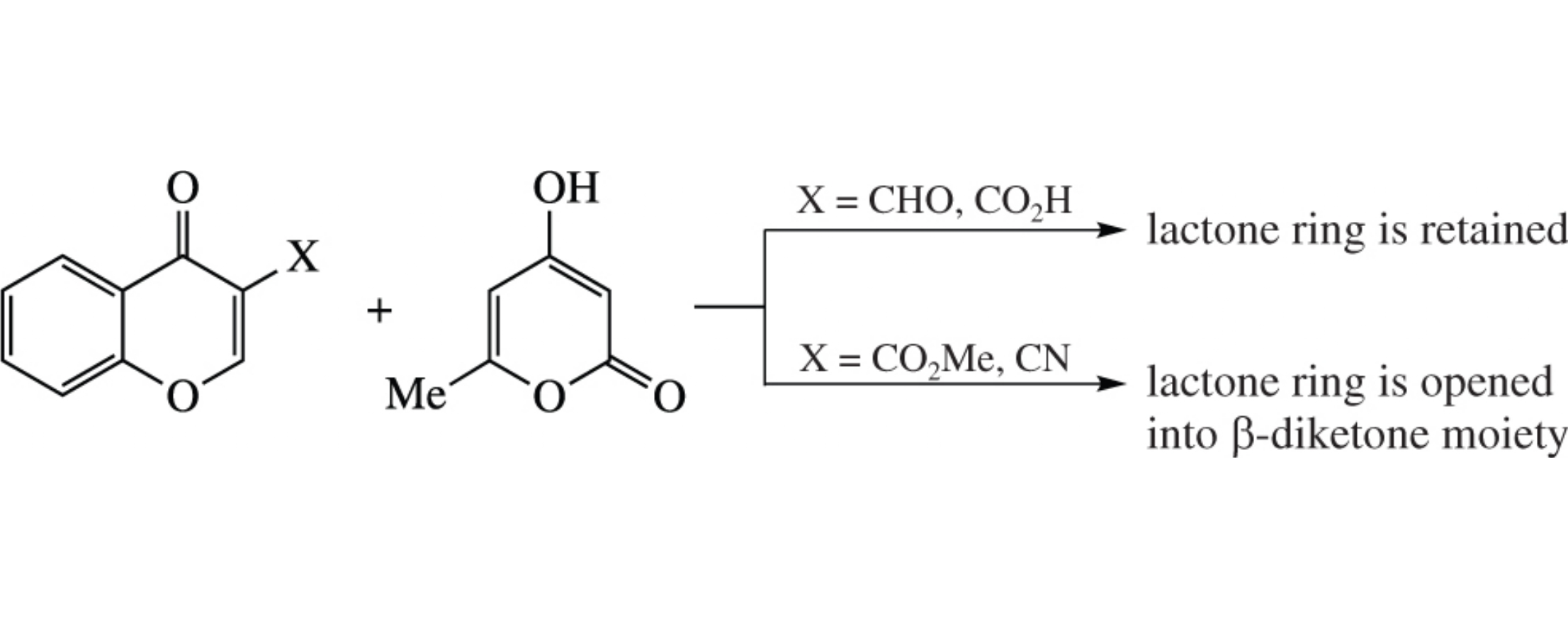 Reaction of 3-formylchromones and triacetic acid lactone proceeds with retention of the chromone skeleton and cyclization into pyrano[3′,4′:5,6]pyrano[2,3-b]chromene system. The crystal structure of the reaction product from unsubstituted 3-formylchromone has been determined from X-ray data. Other chromone analogues bearing CO2H, CO2Me and CN substituents react with triacetic acid lactone affording an o-hydroxychalcone heteroanalogue, pyrano[3,2-c]chromene and chromeno[2,3-b]pyridine derivatives, respectively.