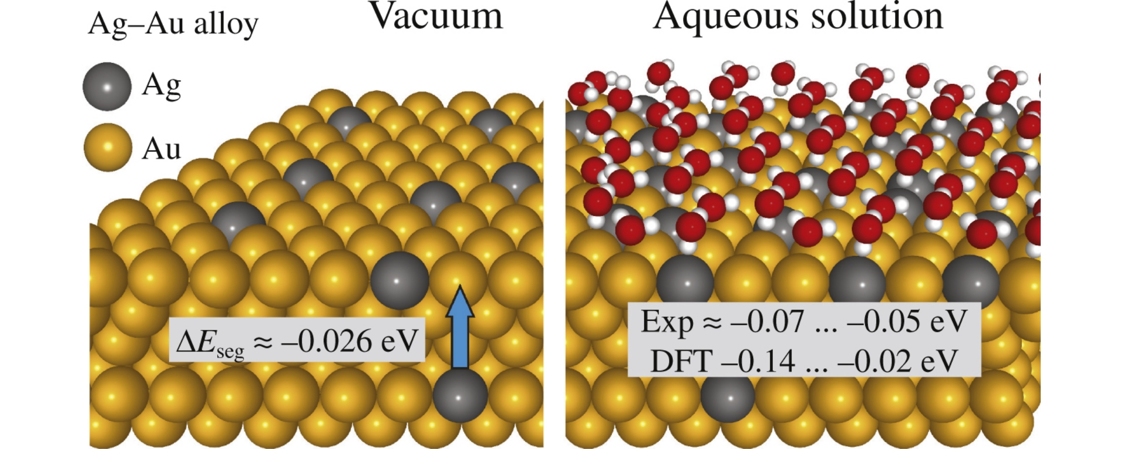 Segregation energy of Ag atoms in Ag(3%) and Ag(10%) silver–gold alloys is more than two times decreased upon the transition from vacuum to aqueous solutions. The DFT calculations using the (111) face of Au as an example have revealed that the effect of OH radical adsorbed together with H2O molecules on the surface Ag atoms on the segregation energy is comparable to that of a water monolayer. Both experimental and model dependences of the segregation energy and the coverage with Ag on the cluster charge and electrode potential were analyzed.