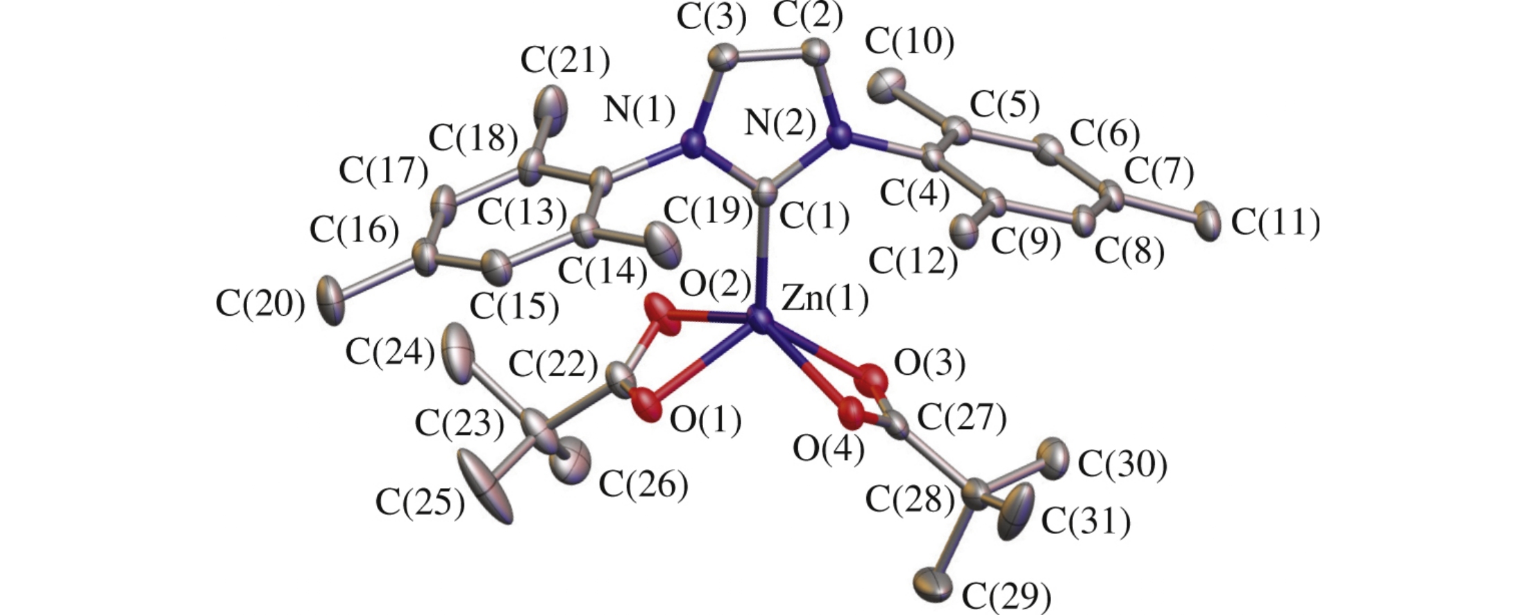 An adduct of ZnII pivalate with N-heterocyclic carbene 1,3-bis(2,4,6-trimethylphenyl)imidazol-2-ylidene has been prepared and characterized by X-ray diffraction analysis, NMR spectroscopy and DFT calculations. The compound preserves mononuclear structure in solution and does not switch the coordination mode from normal to abnormal.