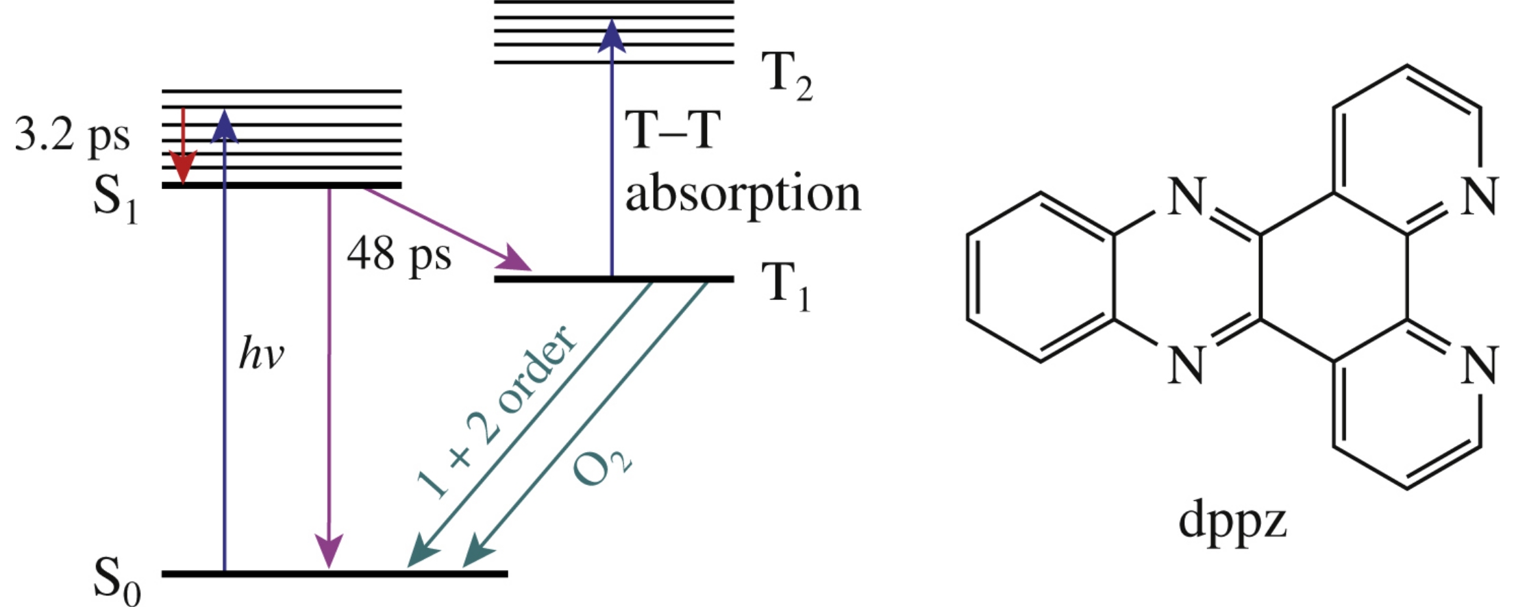 The photophysical and photochemial properties of dipyrido[3,2-a:2′,3′-c]phenazine (dppz) in acetonitrile have been investigated by laser flash photolysis and ultrafast pump-probe spectroscopy. The excitation of dppz to the first singlet excited state was followed by vibrational cooling with solvent relaxation for ∼3ps and then intersystem crossing for ∼50ps. Spectral and kinetic characteristics of the triplet excited state have been determined.