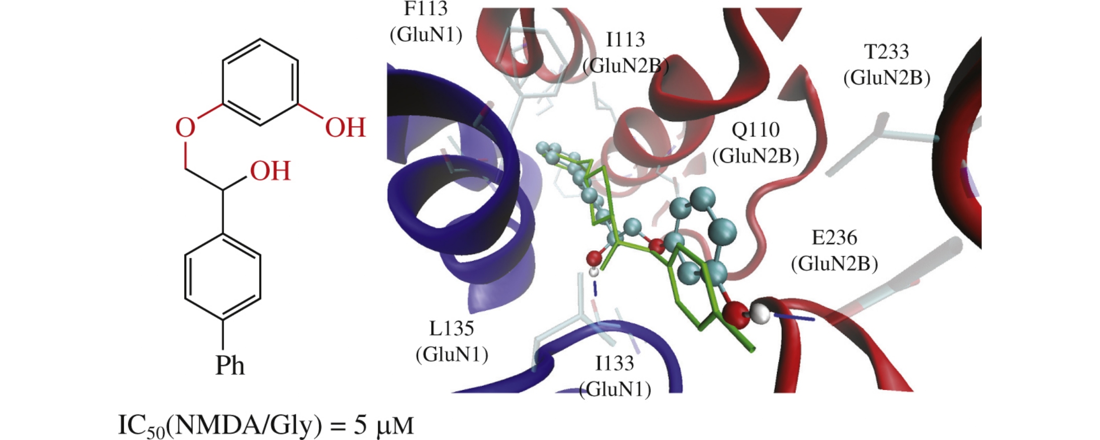 Ifenprodil-like NMDA receptor negative allosteric modulator based on the biphenyl scaffold has been identified using virtual screening. Docking approach demonstrated that the modulator maintains some characteristic interactions with protein similar to ifenprodil. Electrophysiological and radioligand investigations demonstrated the concentration-dependent NMDA/Gly-induced currents inhibition with IC50=5μM and significant displacement of [H3]ifenprodil with EC50=30μM, respectively.