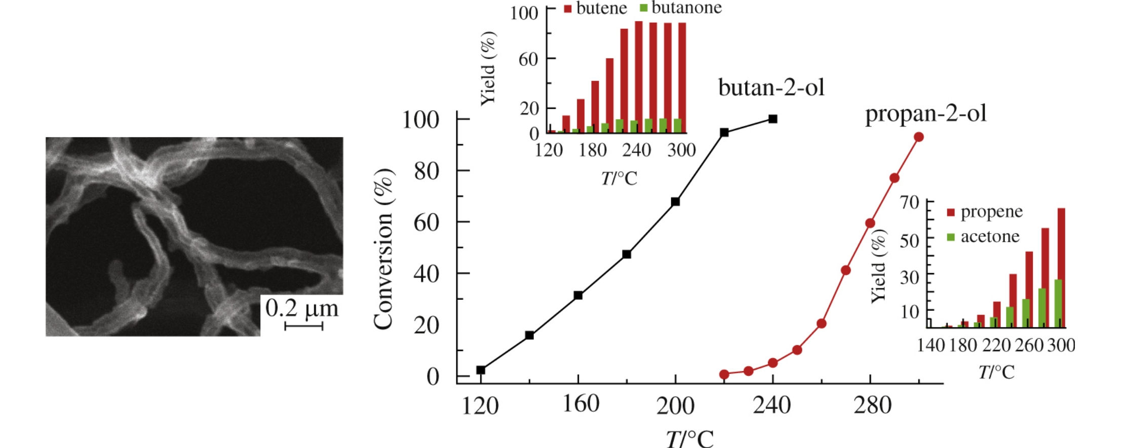 Cylindrical and conical carbon nanotubes were used as catalysts for the conversion of C3–C4 secondary aliphatic alcohols. The effect of the oxidative and reductive treatment of carbon nanotubes on the catalytic activity, selectivity and the conversion of propan-2-ol and butan-2-ol related to the structure of carbon matrix was revealed.