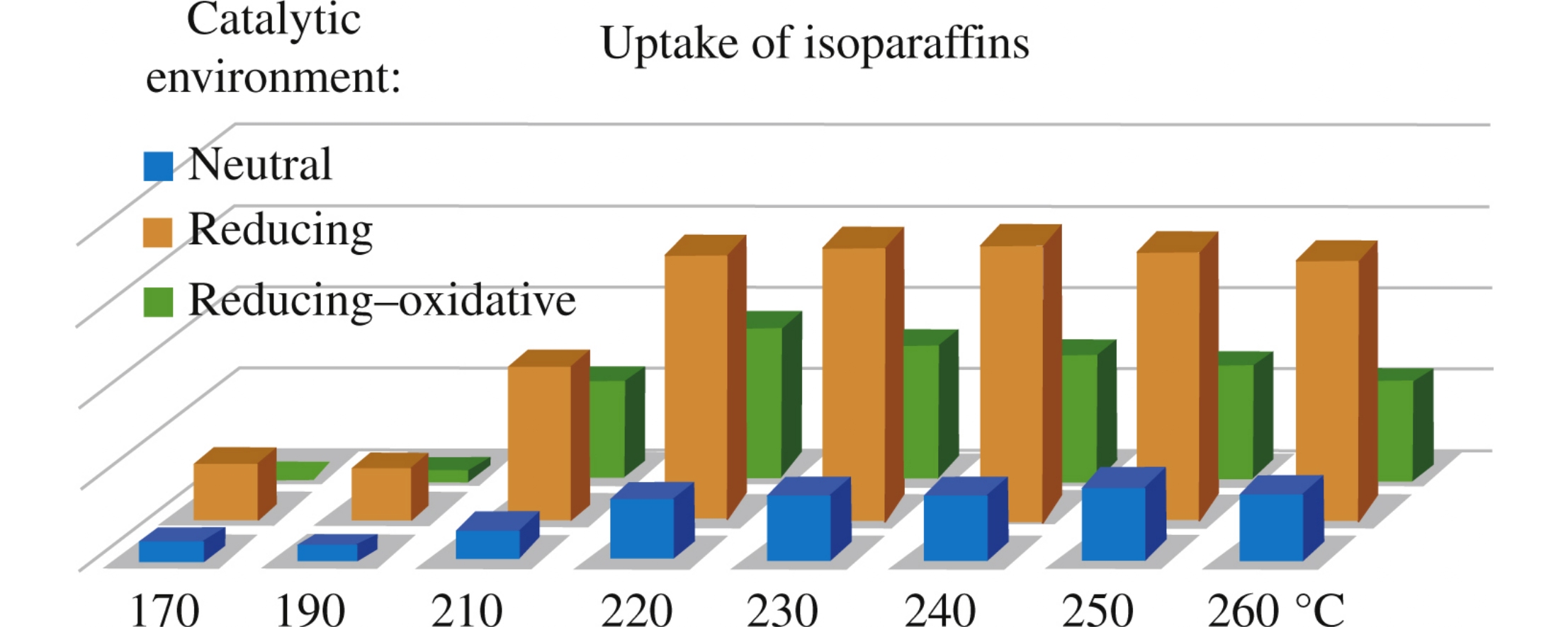 Redox properties of catalytic environment, namely He as neutral, H2 as reducing and H2–H2O as reducing–oxidative one, determine the conversion of hydrocarbons on Co–zeolite catalysts at 170–260°C as well as product distribution. The highest yield of isomerized products was achieved in reducing medium, while the methane formation was suppressed most efficiently in neutral and reducing–oxidative environments. Two distinct ranges can be identified for temperature dependencies of reaction parameters, namely 170–210 and 220–260°C.
