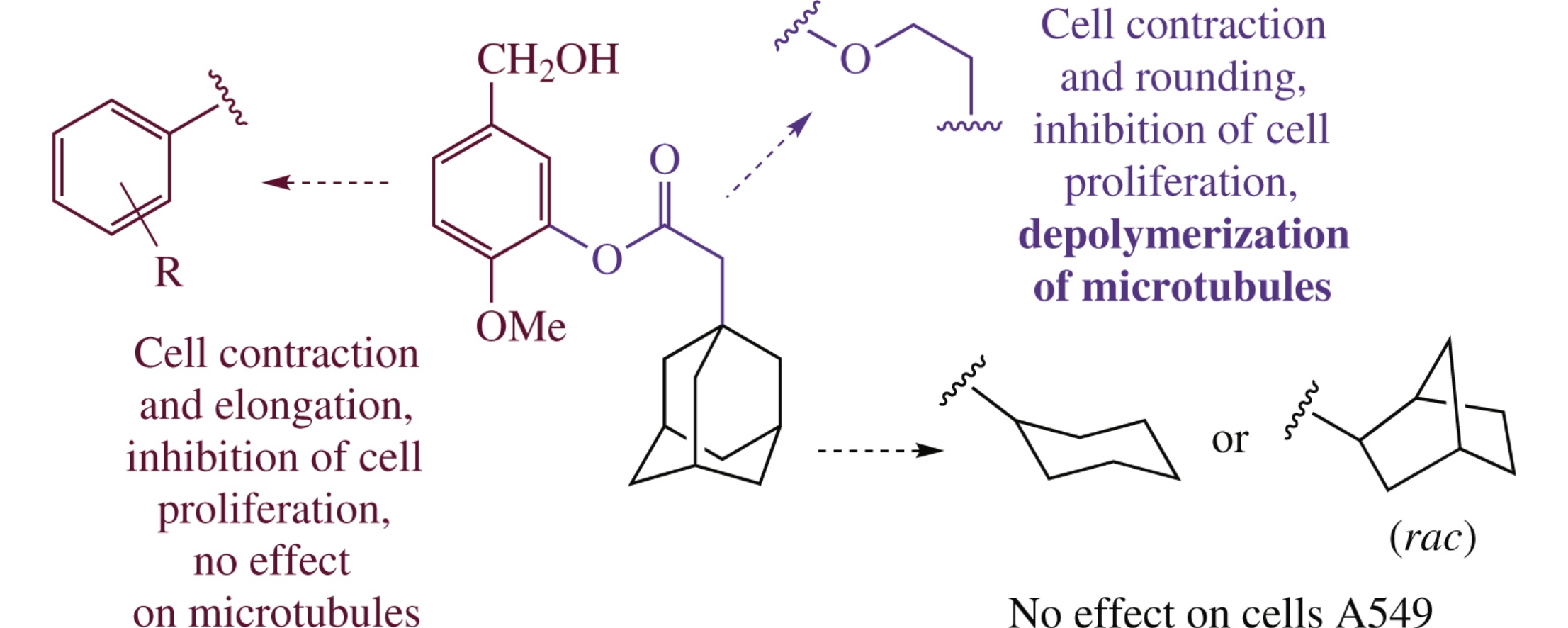 5-Hydroxymethyl-2-methoxyphenyl adamantane-1-acetate inhibits cell proliferation and stimulates depolymerization of microtubules of cancer cells to free tubulin. Its analogues were synthesized via the Steglich or Mitsunobu reactions to determine the role of structural subunits of the molecule in tubulin binding. Based on the structure–activity relationship studies, metabolically stable 1-[2-(5-hydroxymethyl-2-methoxyphenyl)ethyl]adamantane was invented, which exhibits a dual-target profile and retains in vitro activity observed for the lead compound.