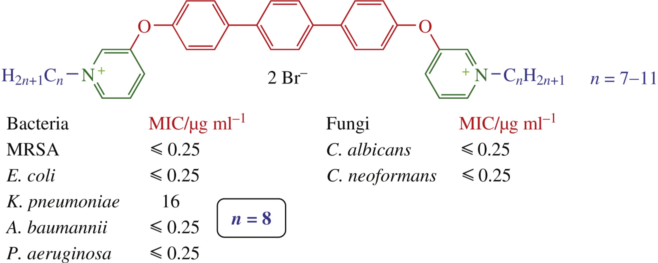 Novel bis-quaternary ammonium compounds with a p-terphenyl spacer between two pyridinium heads were synthesized. Hit compound with C8H17 aliphatic substituent is superior to known benzalkonium chloride, miramistin and chlorhexidine bisgluconate in MIC values against five pathogenic bacteria.
