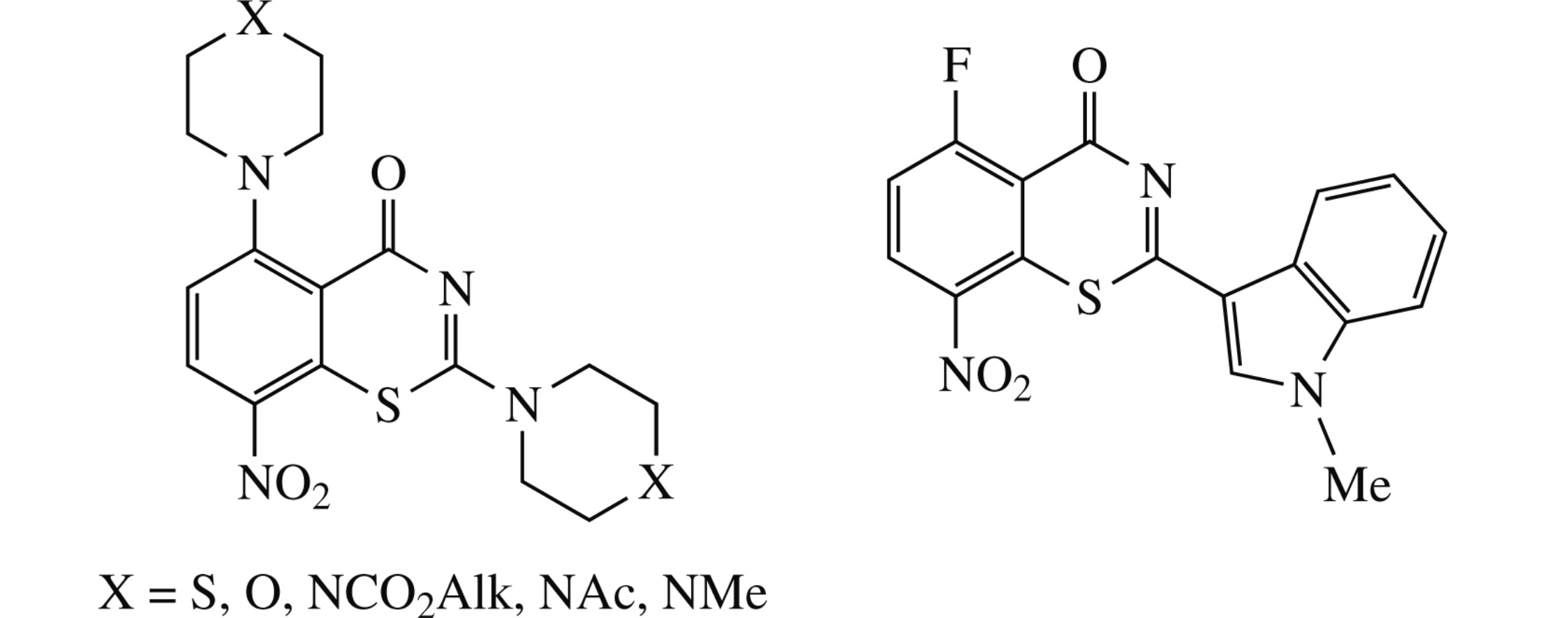 New 2,5-bis(azacyclohex-1-yl)-8-nitro-1,3-benzothiazin-4-ones were synthesized from 2,6-difluorobenzoic acid in two preparative stages. The ethoxycarbonylpiperazino derivative surpasses in tuberculostatic activity (MIC 4μgml−1) its 5-fluoro-8-H-counterpart. The first representative of 5-fluoro-8-nitro-1,3-benzothiazin-4-ones was obtained through the condensation of 2,6-difluoro-3-nitrobenzoyl isothiocyanate and N-methylindole.