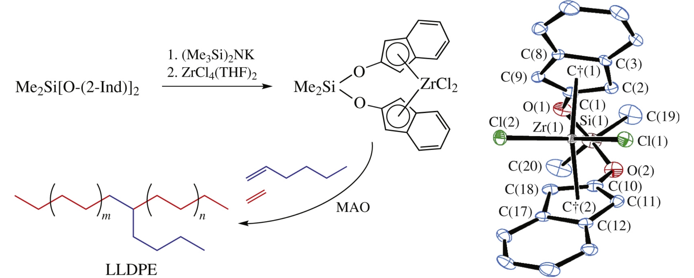 New ansa-zirconocene with bis(inden-2-yloxy)dimethylsilane ligand was synthesized and characterized by NMR spectroscopy and X-ray crystallography. The zirconocene was found to be highly active catalyst of ethylene polymerization and ethylene/hex-1-ene copolymerization upon methylaluminoxane activation.