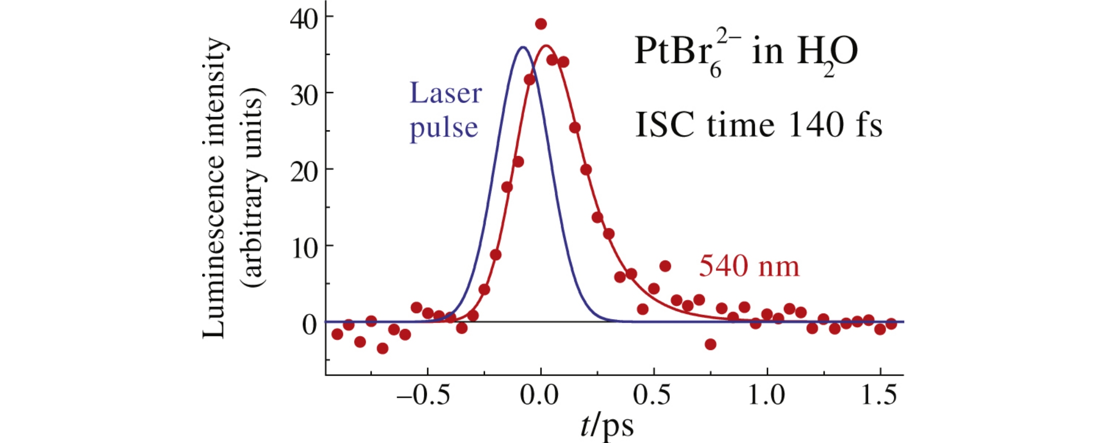 The time of ultrafast intersystem crossing for the PtIVBr62– complex in aqueous solution was measured by a fluorescence up-conversion technique. The corresponding time constant (140 ± 40 fs) is in agreement with that estimated from previous ultrafast transient absorption measurements and with the reported results of theoretical calculations.