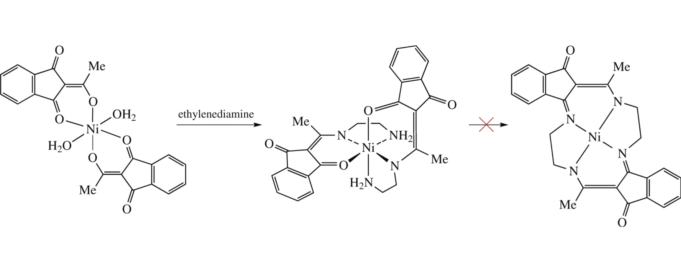 A NiII-directed template synthesis using 2-acetyl-1,3-indandione and ethylenediamine results in formation of octahedral NiII complex, whose crystal structure has been resolved using single crystal X-ray diffraction. The structure indicates that only exocyclic enolic oxygen atom of the triketone takes part in the condensation with ethylenediamine. Quantum chemical calculations reveal insights into the observed reactivity of an initial NiII complex of 2-acetyl-1,3-indandione with ethylenediamine and point out steric effects as the main restriction for a complete cyclization into a tetraaza macrocycle.