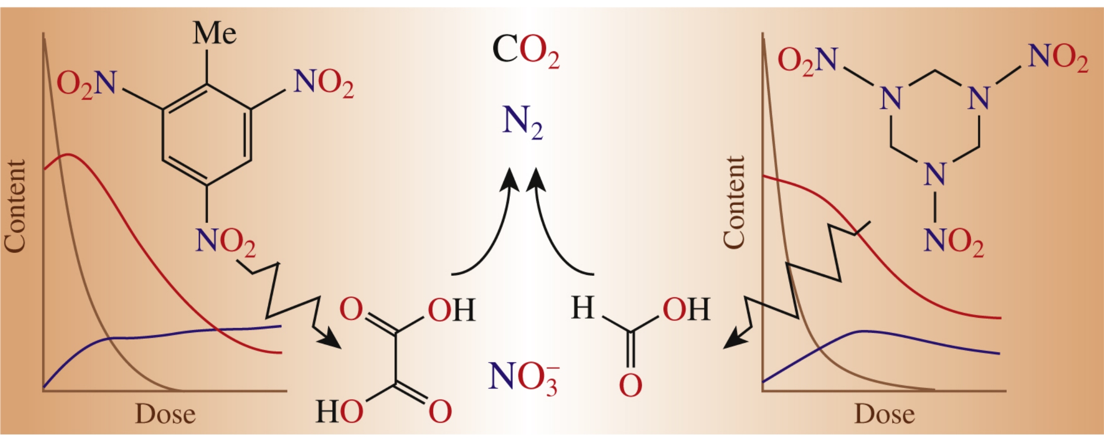 Electron beam treatment would cause conversion of trinitrotoluene and 1,3,5-trinitrohexahydro-1,3,5-triazine into biodegradable products and thus can be employed for the practical decontamination of ‘red’ wastewater in combination with bio-treatment.