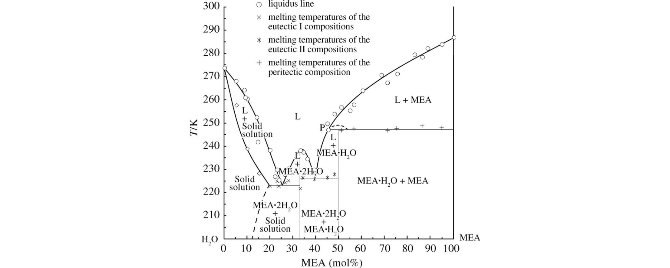 DSC and DTA were used to construct the phase diagram of the water–monoethanolamine (MEA) system in a temperature range of 133–313K. The phase diagram is characterized by the supercooling of a liquid phase and devitrification at ∼150K. MEA·2H2O (congruently melted at 238K), MEA·H2O (incongruently melted at 248K), and limited solid solutions of MEA in H2O were detected.