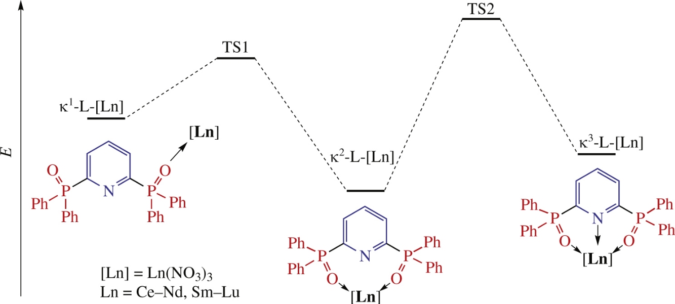 The geometries of a series of lanthanide complexes with phosphine oxide-type ligands (either mono- or polydentate) were optimized using the PM6/Sparkle semiempirical computational approach. The activation barriers of coordination reactions (i.e. the conversion of a complex with κ1-bound ligand into a complex with multiply bound one) were estimated. The κ2-chelate formation with a pyridine-2,6-diylbis(diphenylphosphine oxide) ligand is favorable only for a few largest lanthanides, while κ1-coordination is the most probable case for the smaller ones.
