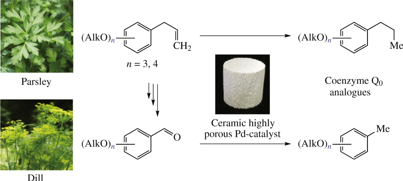 A technologically advanced protocol has been developed for converting plant allyl(polyalkoxy)benzenes to methyl- and propyl(polyalkoxy)benzenes being intermediates in the syntheses of coenzyme Q0 analogues. The key stage of allyl and benzaldehyde moieties hydrogenation was carried out in a periodical autoclave mode on highly porous ceramic block Pd-catalysts. These catalysts possess large surface area, low hydraulic resistance, significant thermal and mechanical stabililty, multiple cycling and easy regeneration, which can dramatically reduce Pd consumption.