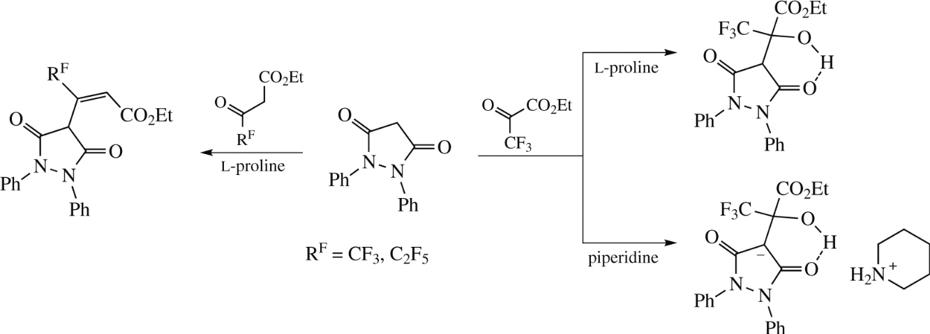 Fluorine-containing analogues of non-steroidal antiinflammatory drugs Tribuzone and Ketazone have been synthesized by reaction of 1,2-diphenylpyrazolidine-3,5-dione with polyfluoroalkyl-containing 3- and 2-oxo esters. Ethyl 3-(pyrazolidin-4-yl)-3-(polyfluoroalkyl)prop-2-enoates have been obtained as Knoevenagel reaction products from 3-oxo esters in the presence of l-proline. Unlike with 3-oxo esters, addition of ethyl 3,3,3-trifluoro-2-oxopropanoate under basic conditions afforded ethyl 2-(pyrazolidin-4-yl)-3,3,3-trifluoro-2-hydroxypropanoate or its salt without elimination of a water molecule.