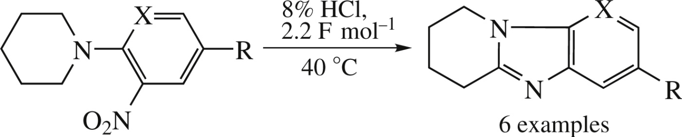 Electrochemical reduction of ortho-piperidino substituted nitro(het)arenes in an undivided cell on a lead cathode in 8% HCl gave either 1,2,3,4-tetrahydropyrido[1,2-a]-benzimidazoles or 6,7,8,9-tetrahydropyrido[3′,2′:4,5]- imidazo[1,2-a]pyridines. The reductive heterocyclization mechanism involves the initial formation of a nitroso derivative followed by the formation of an imidazole ring.
