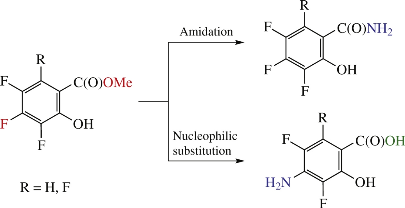 Polyfluorinated analogues of salicylamide and p-aminosalicylic acid have been synthesized based on methyl polyfluorosalicylates. Polyfluorosalicylamides were obtained by the reaction with aqueous ammonia, while 4-aminopolyfluorosalicylic acids were prepared in two steps via regio-oriented nucleophilic replacement of para-positioned fluorine atom with azido group followed by its reduction. 3,4,5-Trifluorosalicylamide showed pronounced analgesic in vivo activity in hot plate test while 4-amino-3,5-difluorosalicylic acid revealed high tuberculostatic activity.