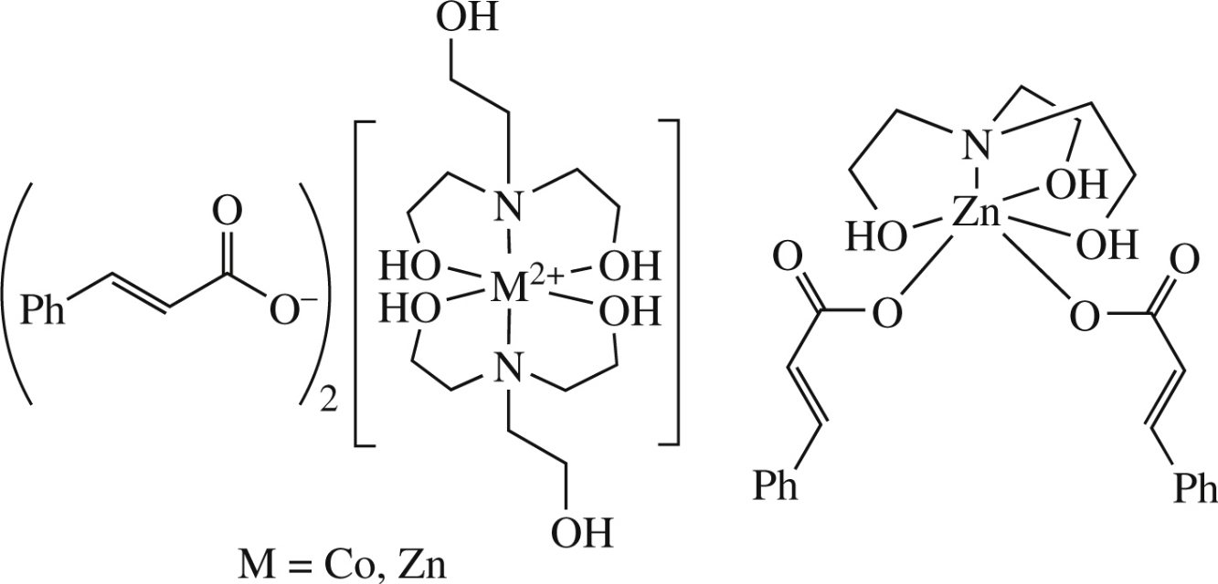 New hydrometallatranes, viz. complexes of triethanolamine with Znii and Coii cinnamates, have been synthesized and characterized by IR spectroscopy, ESI mass spectrometry, elemental and thermal analyses. The structure of cobalt complex has been solved using single-crystal X-ray diffraction. The compounds synthesized and their analogues have been tested for antimicrobial activity.