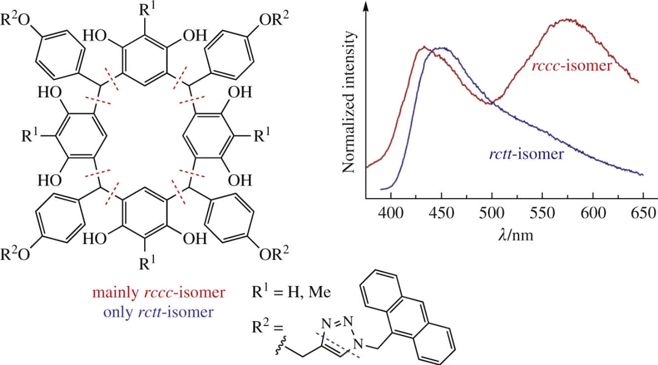 New calix[4]resorcinols with four anthracene-ended triazolecontaining fragments as rctt- and rccc-diastereoisomers were obtained in two synthetic pathways, namely, by acidcatalyzed condensation of resorcinols with 4-{[1-(anthracen-9-ylmethyl)-1H-[1,2,3]triazol-4-yl]methoxy}benzaldehyde or by the click reaction of 9-(azidomethyl)anthracene with calix[4]resorcinols bearing four terminal acetylene moieties. The compounds obtained demonstrate dual emission in solid state with intensity of low energy band depending on calix[4]resorcinol conformation. The emission in solutions is dominated by anthracene bands, with rccc-isomer showing additional low energy band.