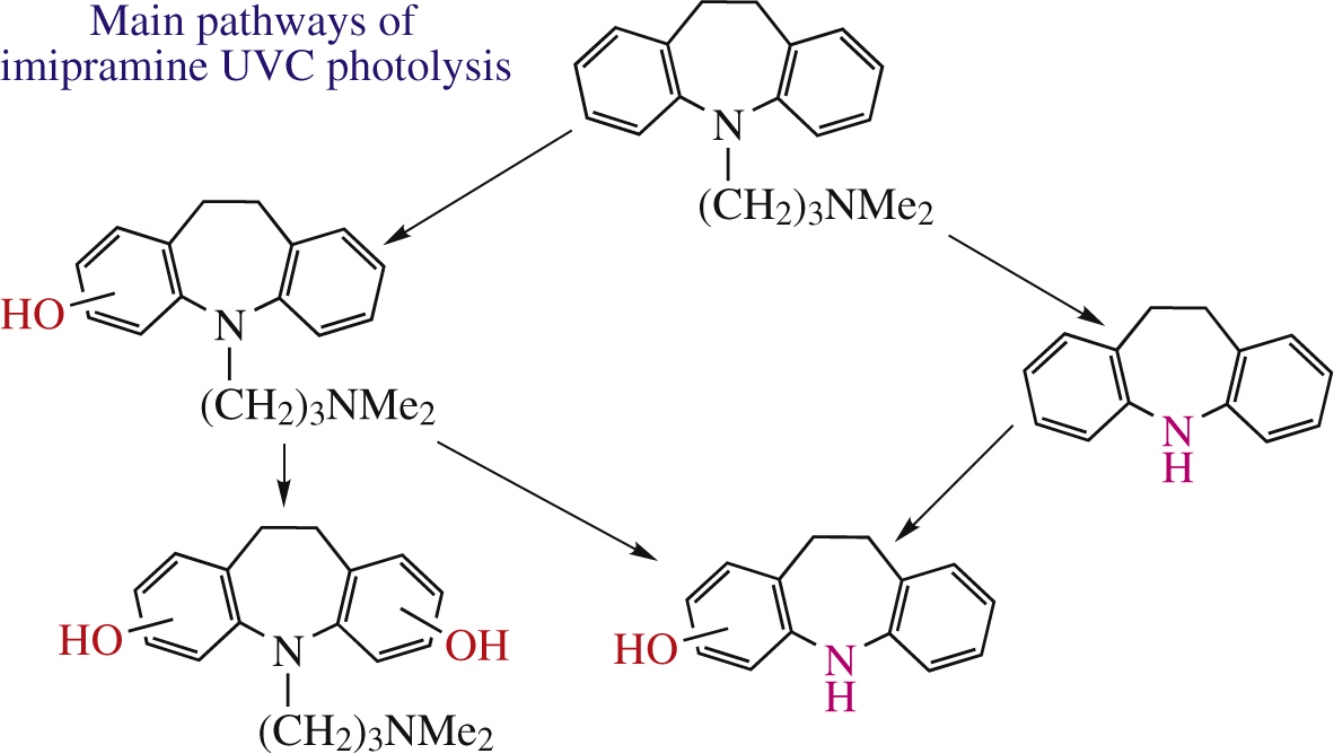 Mechanism of direct UVC photolysis of dibenzazepine-type drug imipramine (IMI) was revealed by the combination of laser flash photolysis for the detection of short lived intermediates and steady-state photolysis coupled with LC-MS for identification of final products. Both quantum yield of IMI photoionization and molar absorption coefficient of IMI radical cation were determined for the first time.