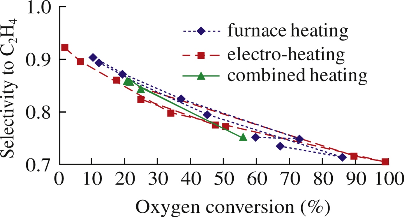 Oxidative dehydrogenation of ethane to ethylene over Mo–V–Fe–Nb–Ox conductive catalyst upon the passing of alternate current through the catalyst bed can be accounted for the electro-heating without additional electronic effects.