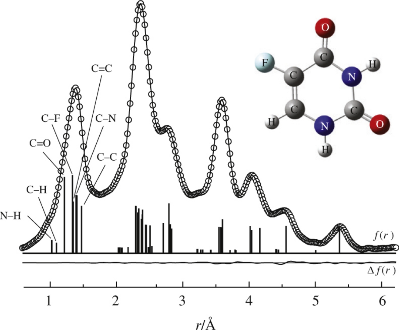 The accurate equilibrium molecular structure of a canonical tautomer of 5-fluorouracil was determined by electron diffraction taking into account anharmonic vibrational corrections calculated with ab initio force field. This structure was applied to benchmark the results of CCSD(T) computations used for the analysis of substitution effects in uracil derivatives.