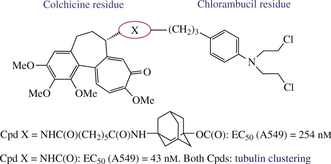 Two new heterobivalent molecules were designed by linking a DNA-alkylating agent chlorambucil with tubulin-targeting compound colchicine or its adamantyl containing C(7)-derivative. Target compounds were synthesized via acid coupling with N-deacetylcolchicine. According to preliminary biotests, both conjugates caused microtubule depolymerization and strong tubulin clustering, and colchicine–chlorambucil conjugate was found to be one order of magnitude more potent and to exhibit some selectivity to A549 carcinoma cells.