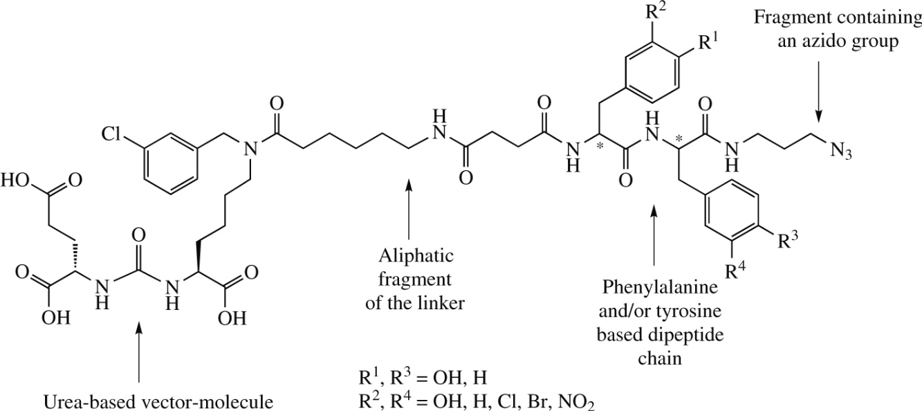 Selective ligands of an urea-based prostate specific membrane antigen with a phenylalanine/tyrosine-based dipeptide linker and with a mingled chiral centers configuration and/or substituted aromatic fragments were prepared in seven steps by liquid- and in six steps by solid-phase synthesis. In vitro test for inhibiting the cleavage of N-acetylaspartylglutamate revealed the optimum linker containing l-phenylalanine in the structure on the N-terminus of a dipeptide chain.