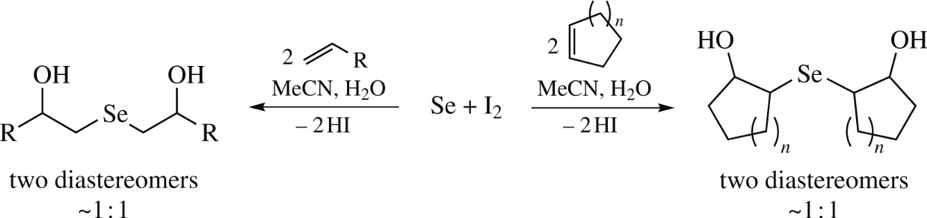 β,β′-Dihydroxy selenides are obtained by the iodine-assisted reaction of elemental selenium with alkenes in aqueous acetonitrile in up to 83% yield and ∼1: 1 diastereomeric ratio. The X-ray analysis of bis(2-hydroxycyclohex-1-yl) selenide revealed it to be the trans,trans-isomer indicating that the reaction occurred stereoselectively as anti-addition.