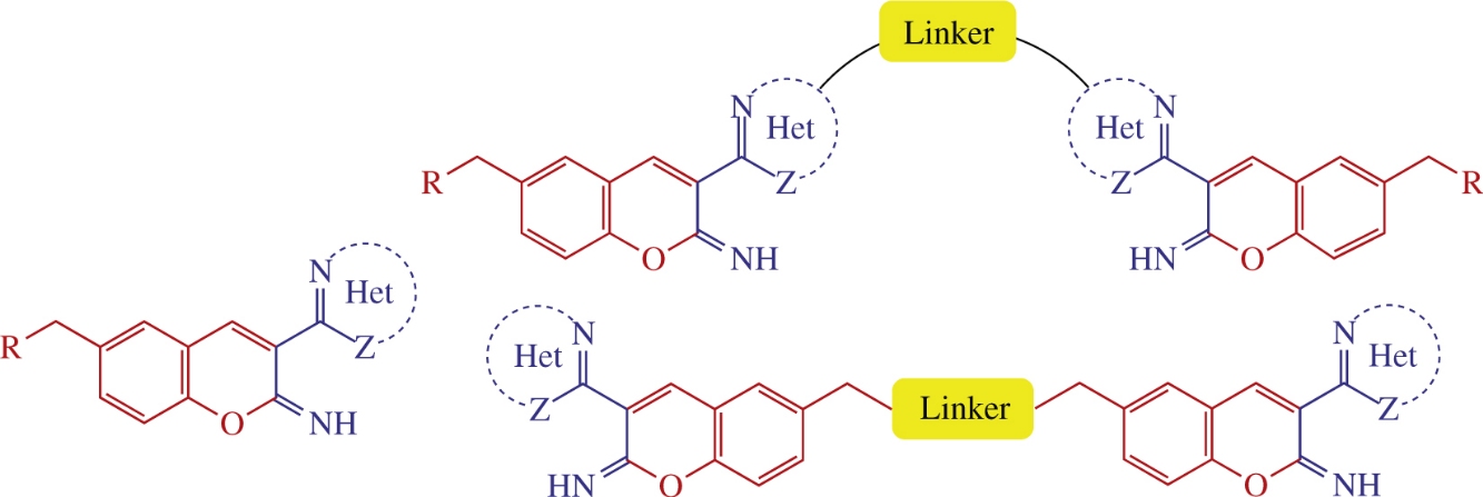 Novel mono- and bis(2H-chromen-2-imine) hybrids linked to different heteroarene units were prepared by cyclocondensation of 2-hydroxybenzaldehydes with 2-heteroarylacetonitriles. Their in vitro antibacterial activities against different strains of Gram-positive and negative bacteria were assessed. Piperazine-linked bis(3-heteroaryl-2Hchromen-2-imines) exhibited the best antibacterial efficacies against E. coli, S. aureus and S. mutans strains with MIC values of 1.4–20.8μm.