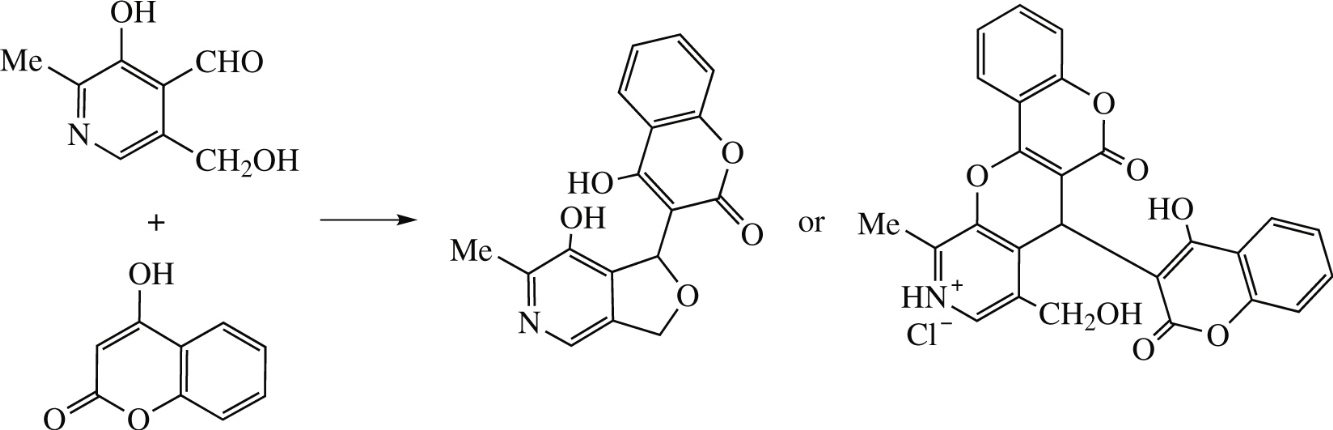 Pyridoxal in the absence of catalyst forms furo[3,4-c]pyridine species (ortho aldehyde and hydroxymethyl groups are involved) which is further transformed into C–C hybrid with 4-hydroxycoumarin. Different products of chromeno-[3′,4′:5,6]pyrano[2,3-c]pyridine type are formed when pyridoxal hydrochloride or more sophisticated 2,4-dihydroxybenzaldehyde derivative are applied (herein, ortho aldehyde and hydroxy groups are involved into heterocyclization).