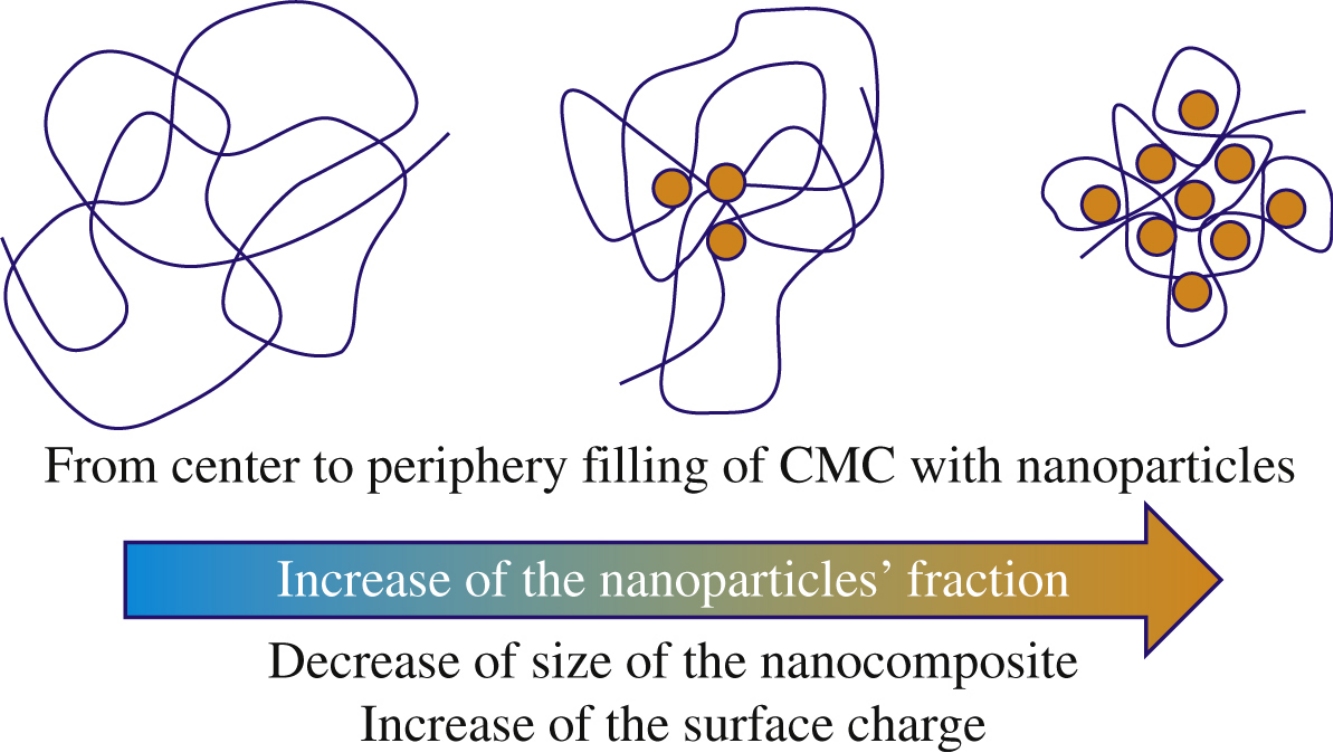 The distribution of nanoparticles in the volume of the composite is determined by a ratio between reagents at the stage of synthesis. At low molar fractions of iron in the system, nanoparticles are formed inside the coils of macromolecules, and nanoparticles expand their formation closer to the surface with an increase in the iron fraction. The size of the nanoparticles remains independent of the polymer/iron ratio in the reaction mixture.